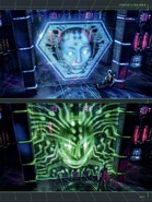 SHODAN originally had a visible Holographic head on the Bridge in-game, but this was removed and in the final game it is only seen in the cutscene.